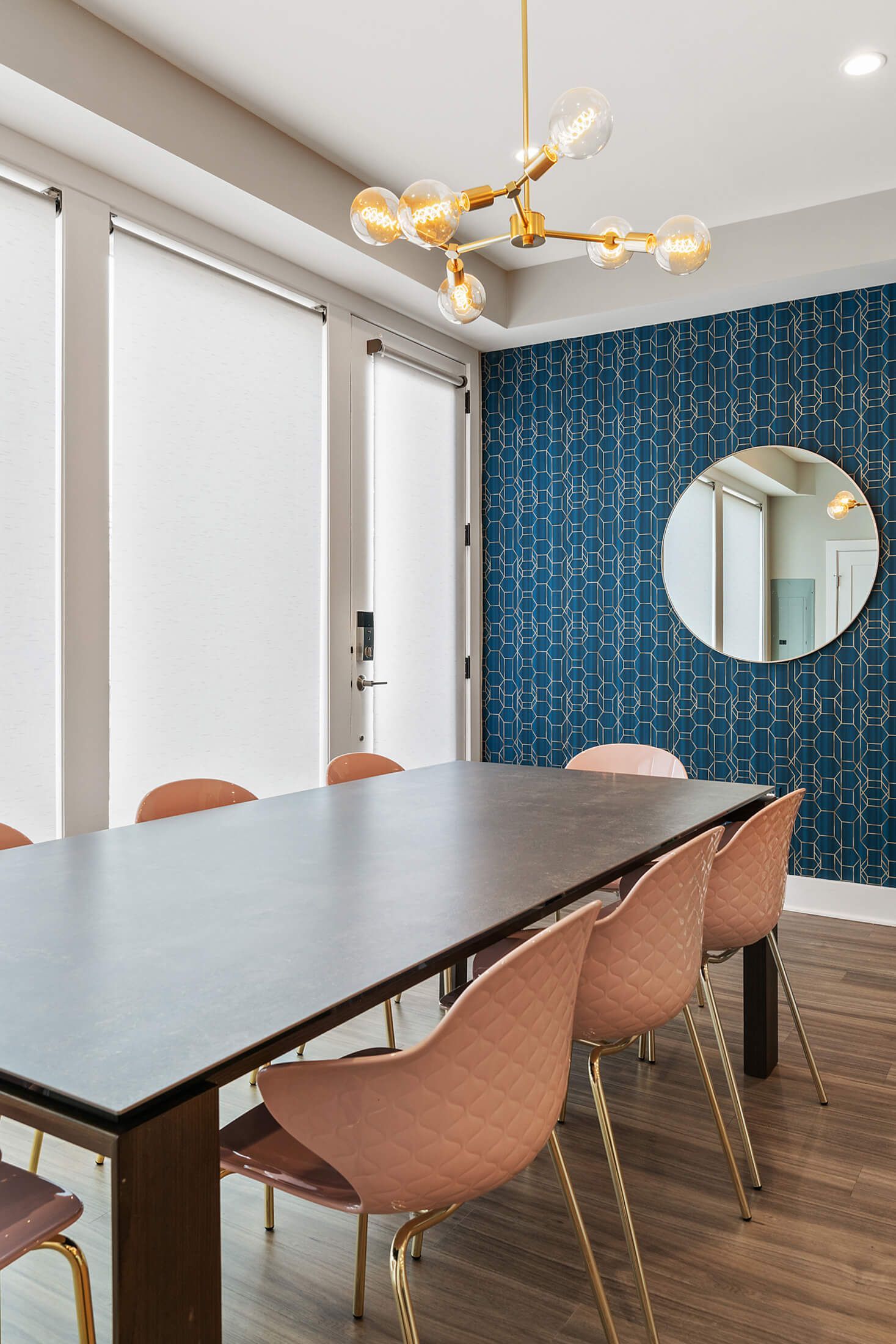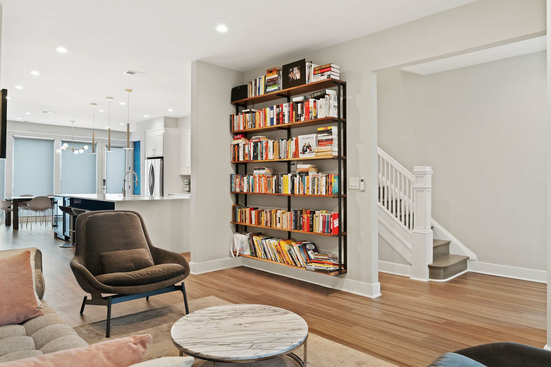 An expansive island anchors this kitchen-dining combo, paired with sleek bar seating, warm wood floors, and contemporary lighting.