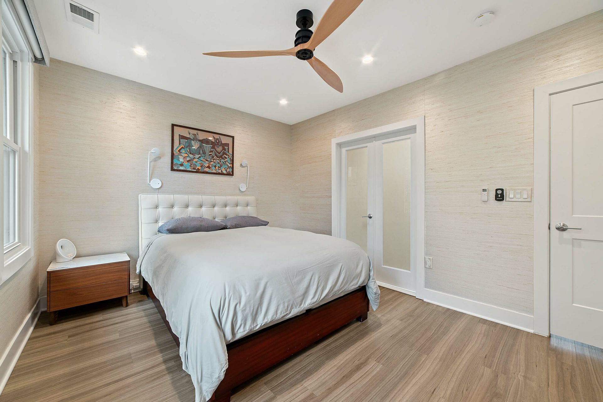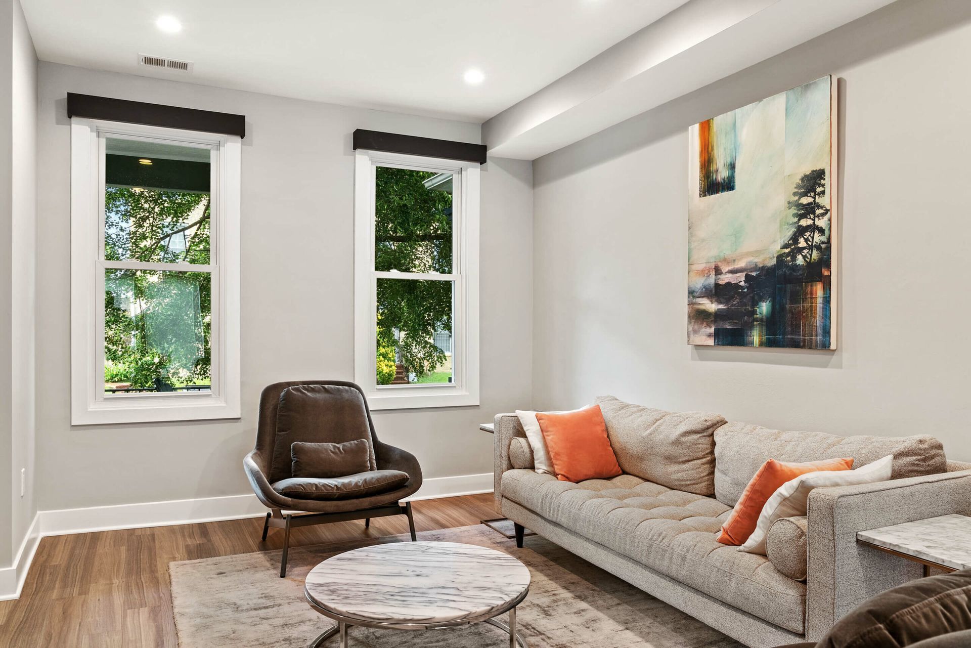 This primary bath features a floating double vanity, a freestanding tub, and playful wall art for a personalized touch.