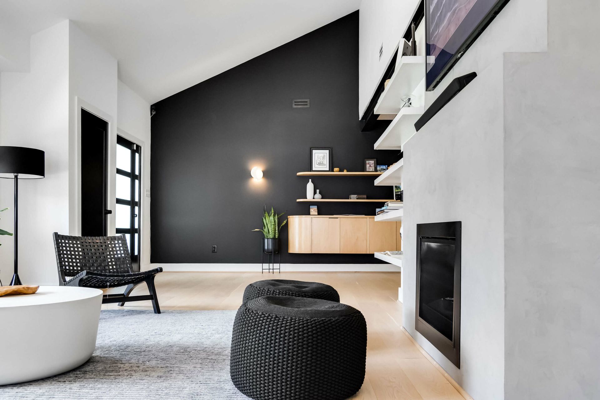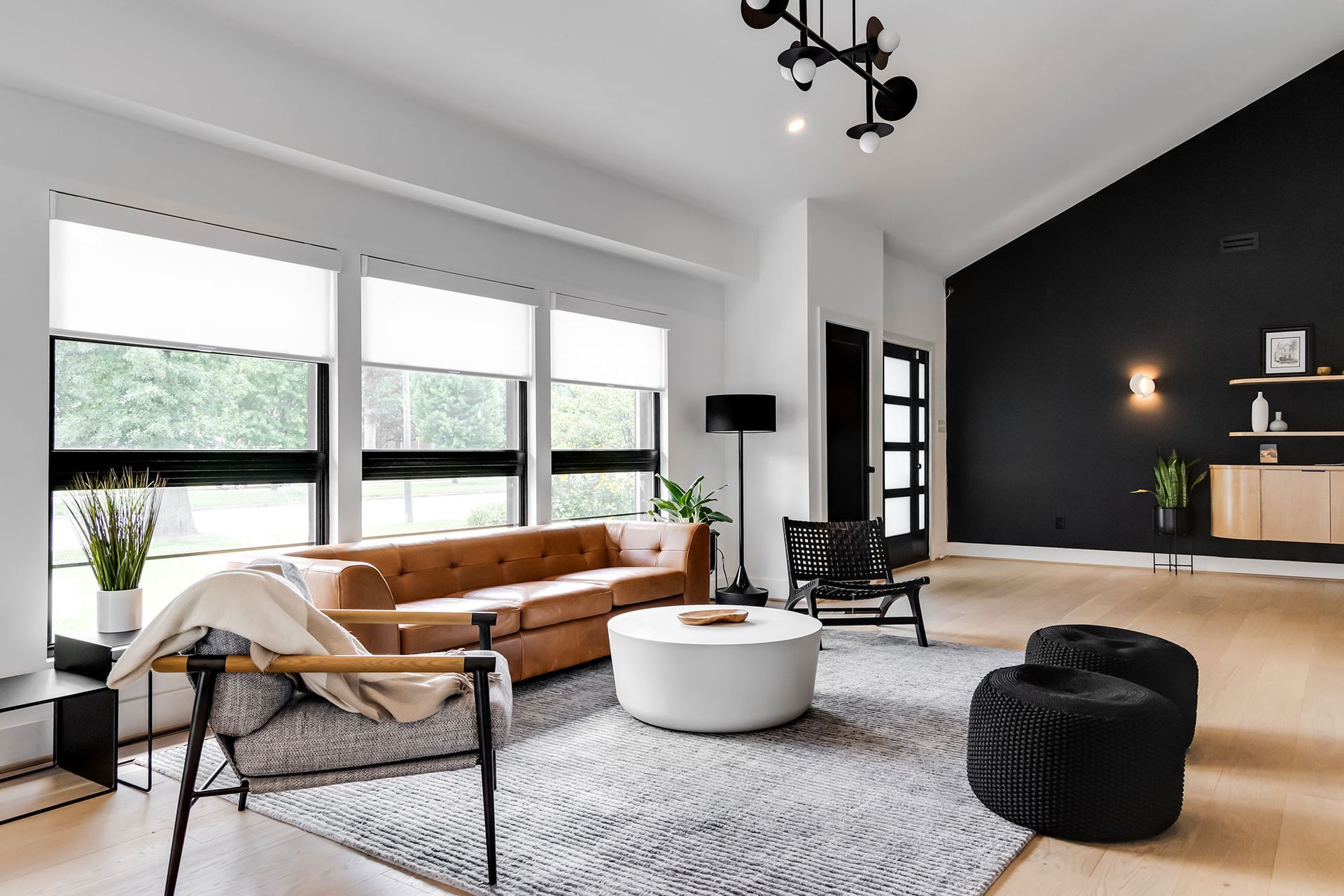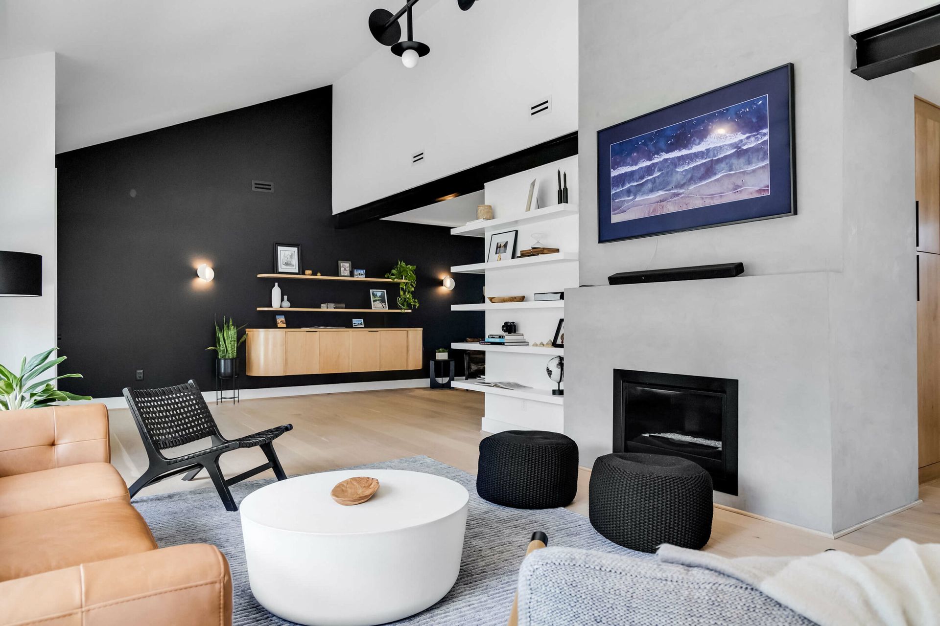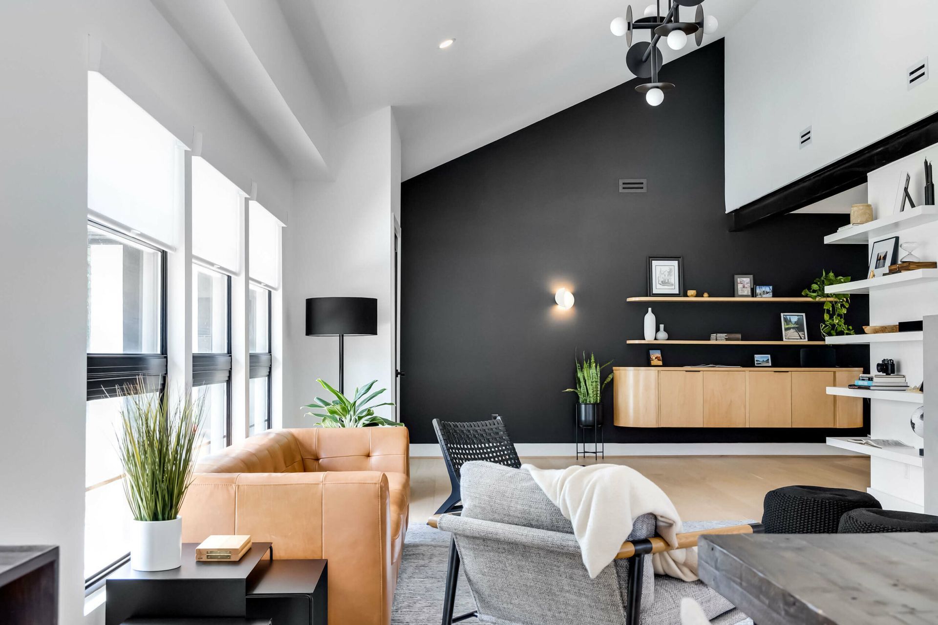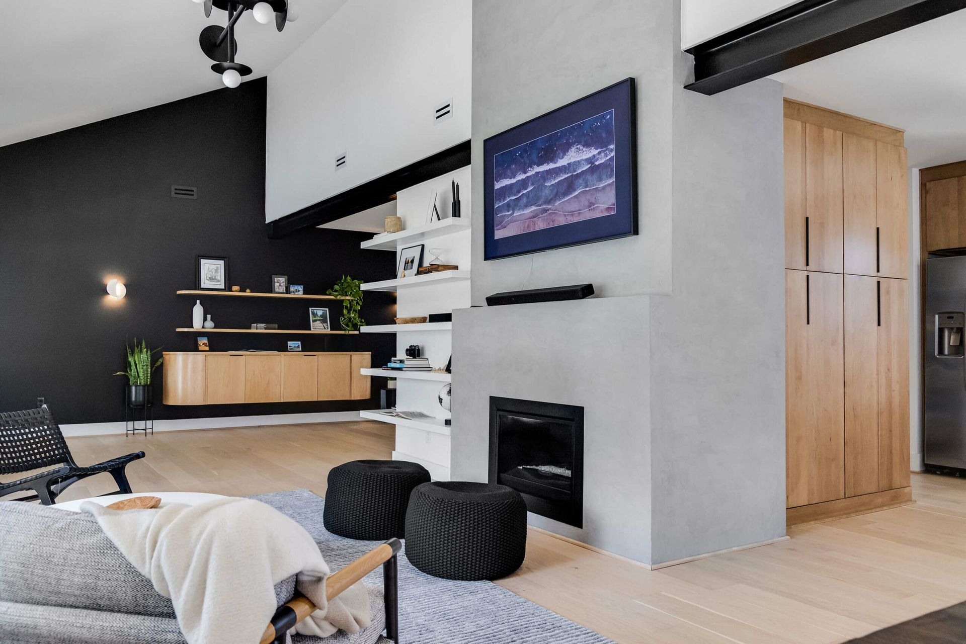 A bold modern kitchen pairs black and white quartz finishes with wood cabinetry, bar seating, and sculptural pendant lighting.