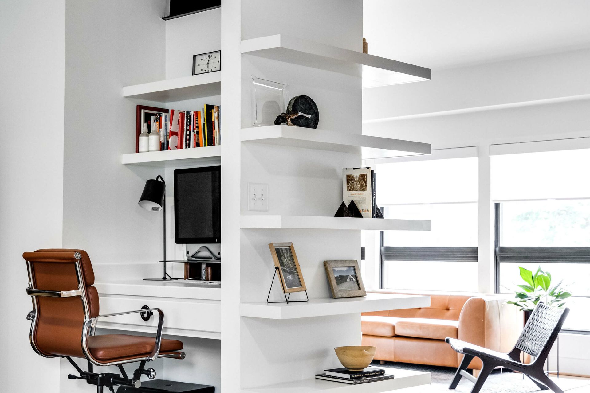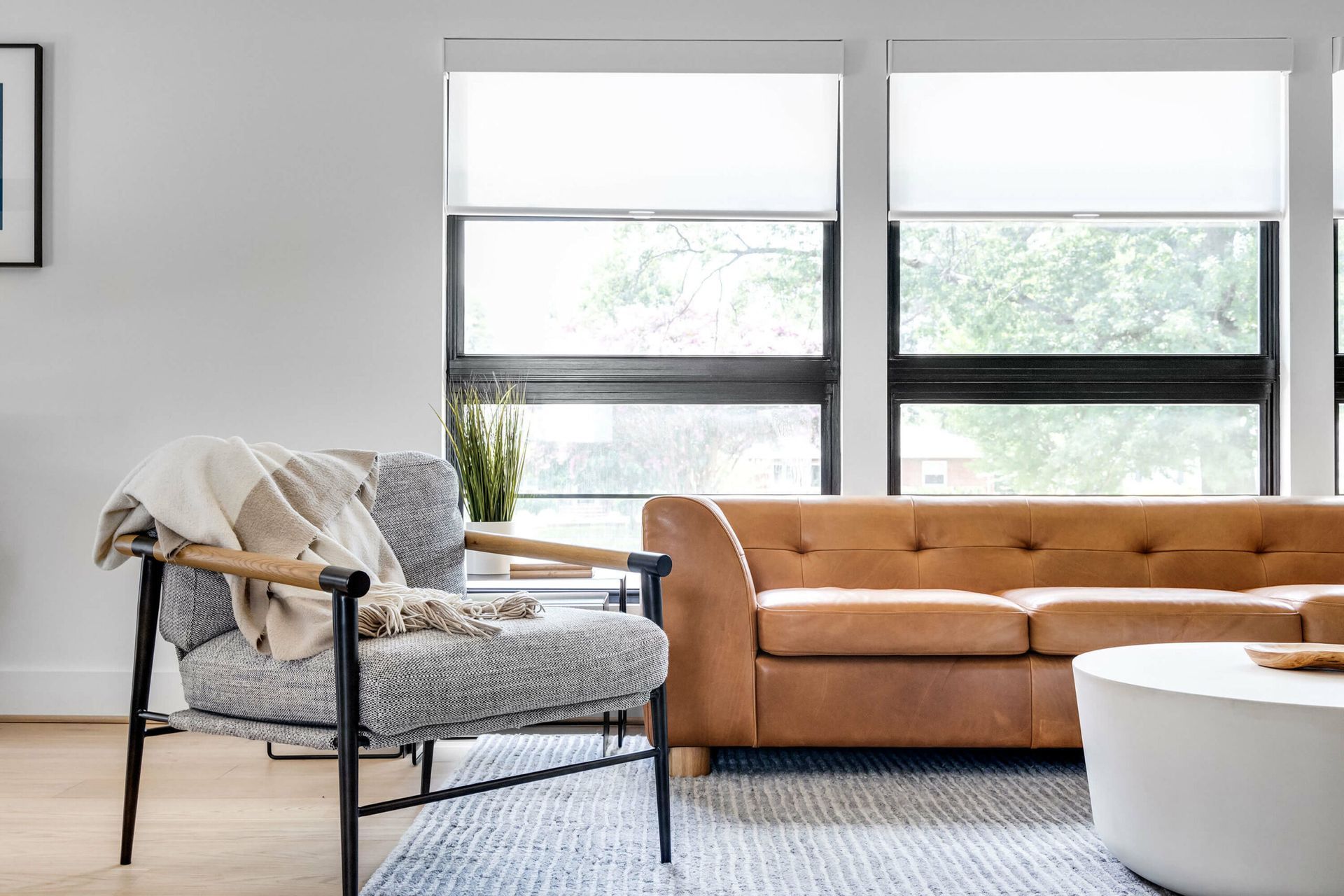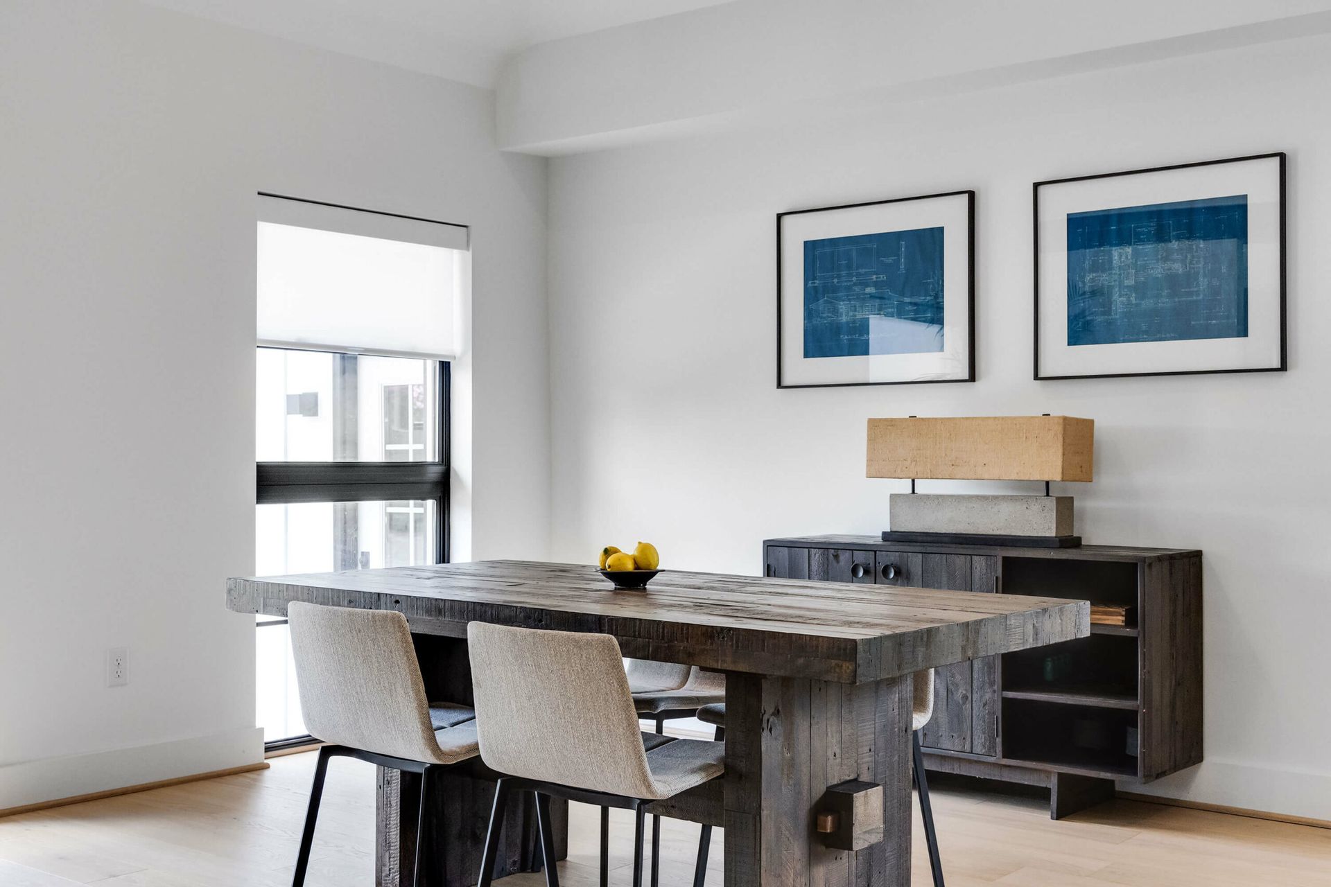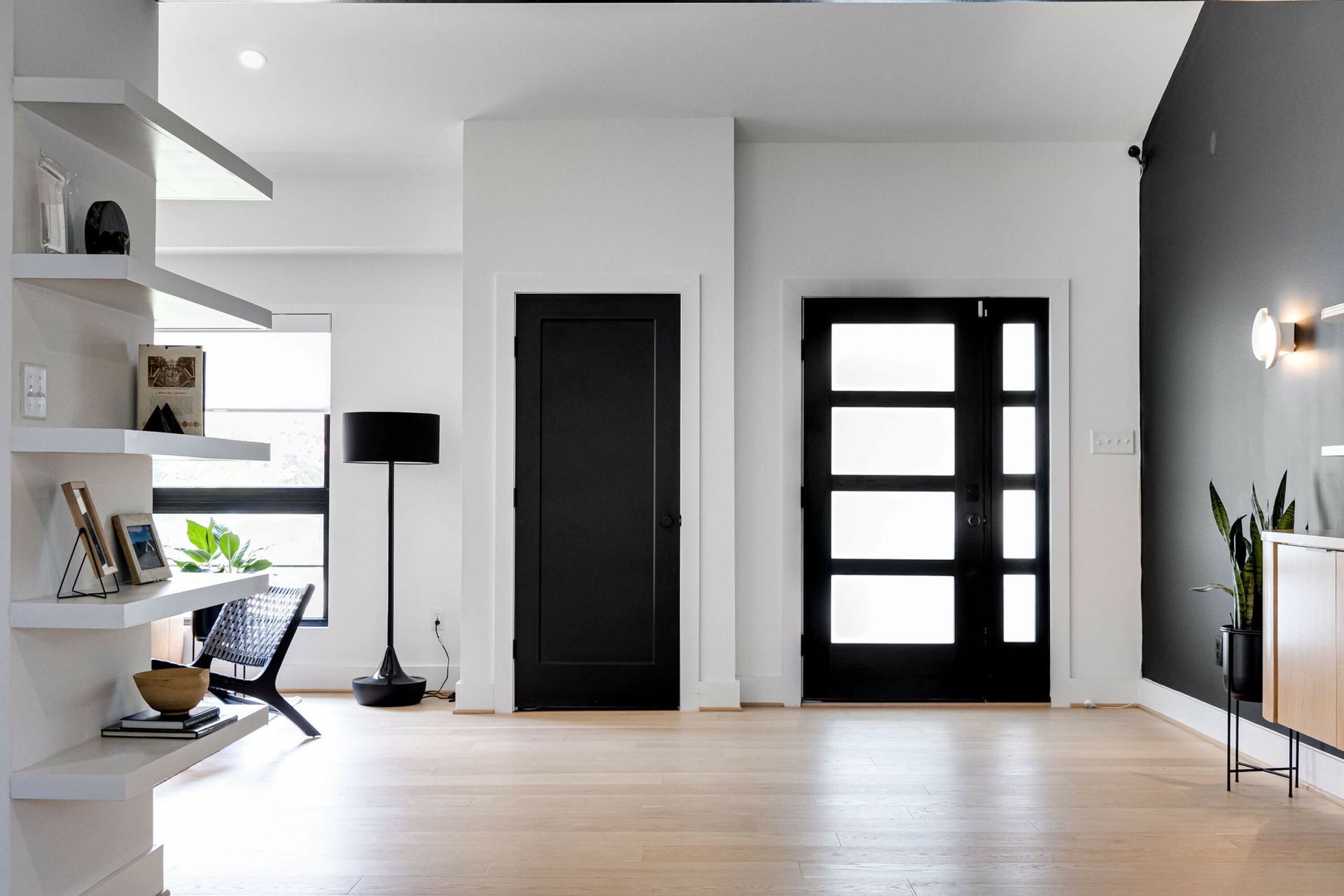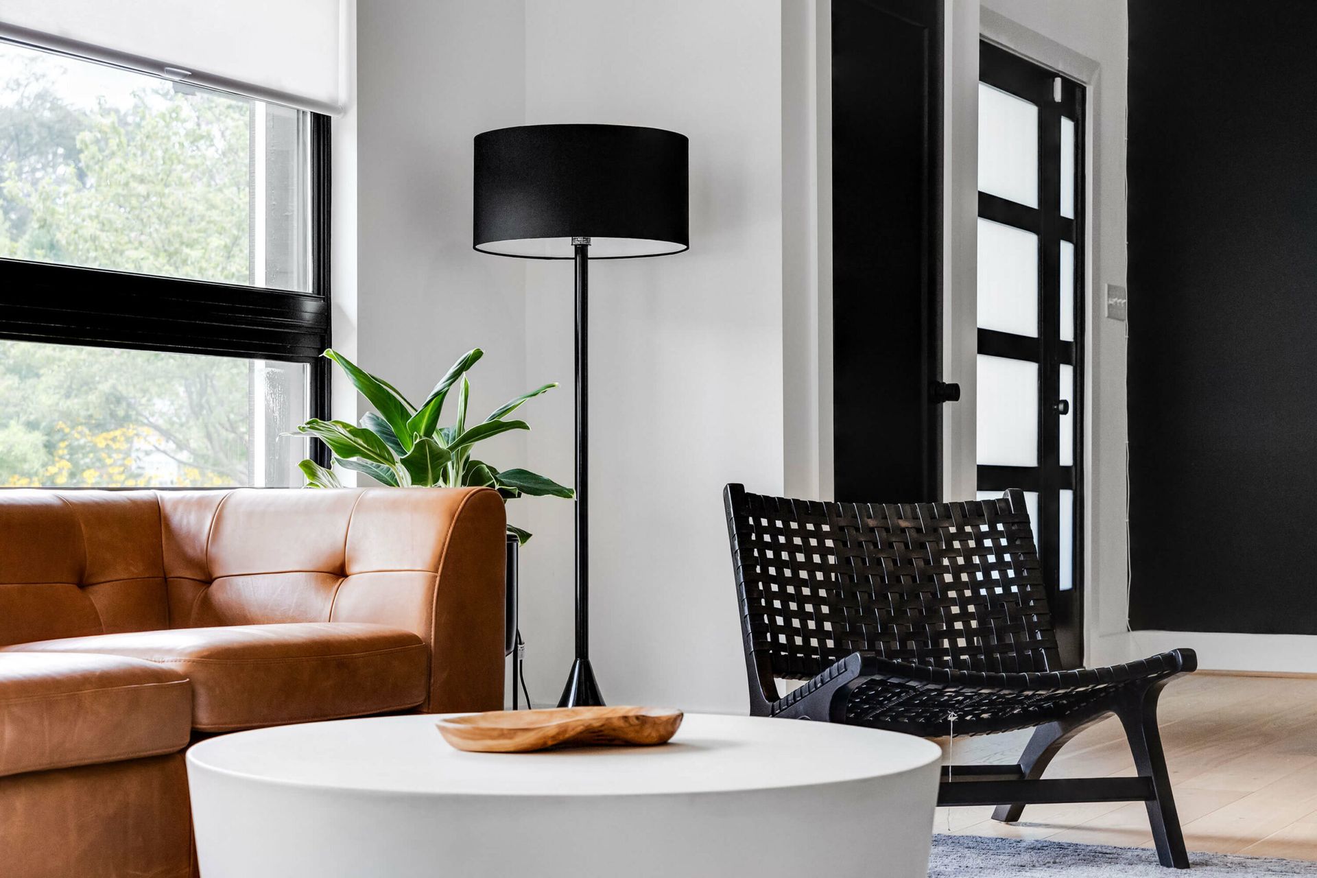 A bold modern kitchen pairs black and white quartz finishes with wood cabinetry, bar seating, and sculptural pendant lighting.