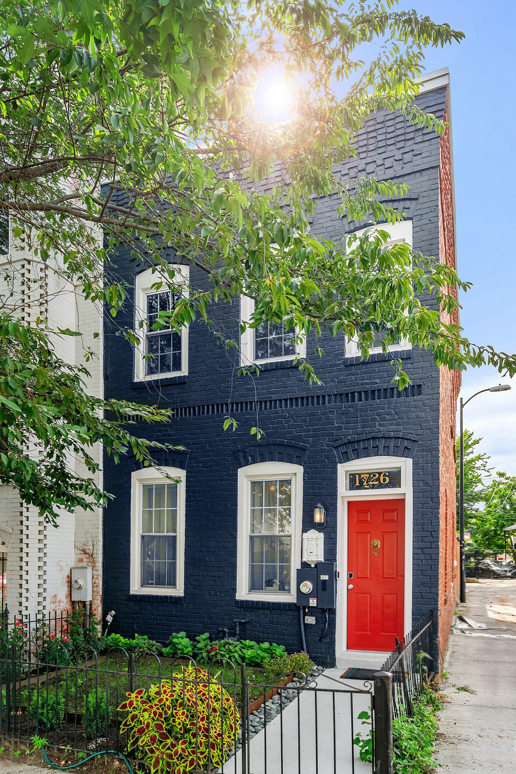 A clean contrast of navy lower cabinets and white uppers brings warmth and polish to this updated kitchen in a historic DC home.