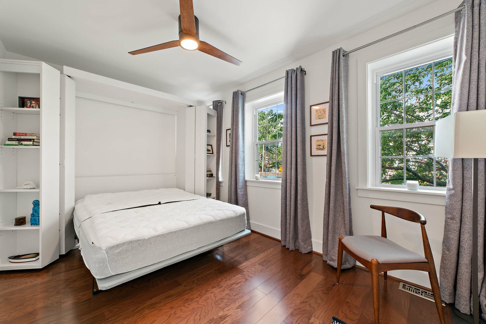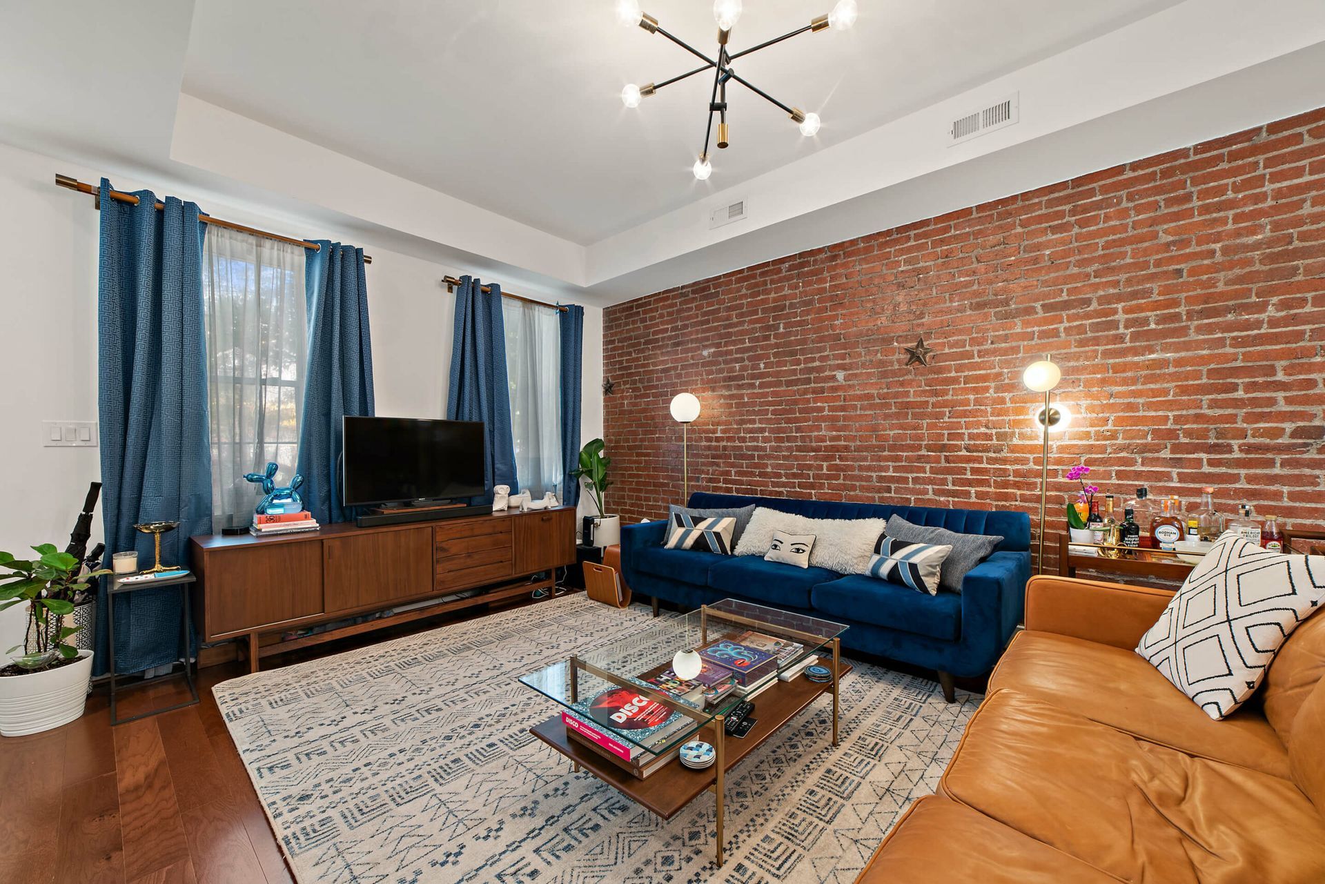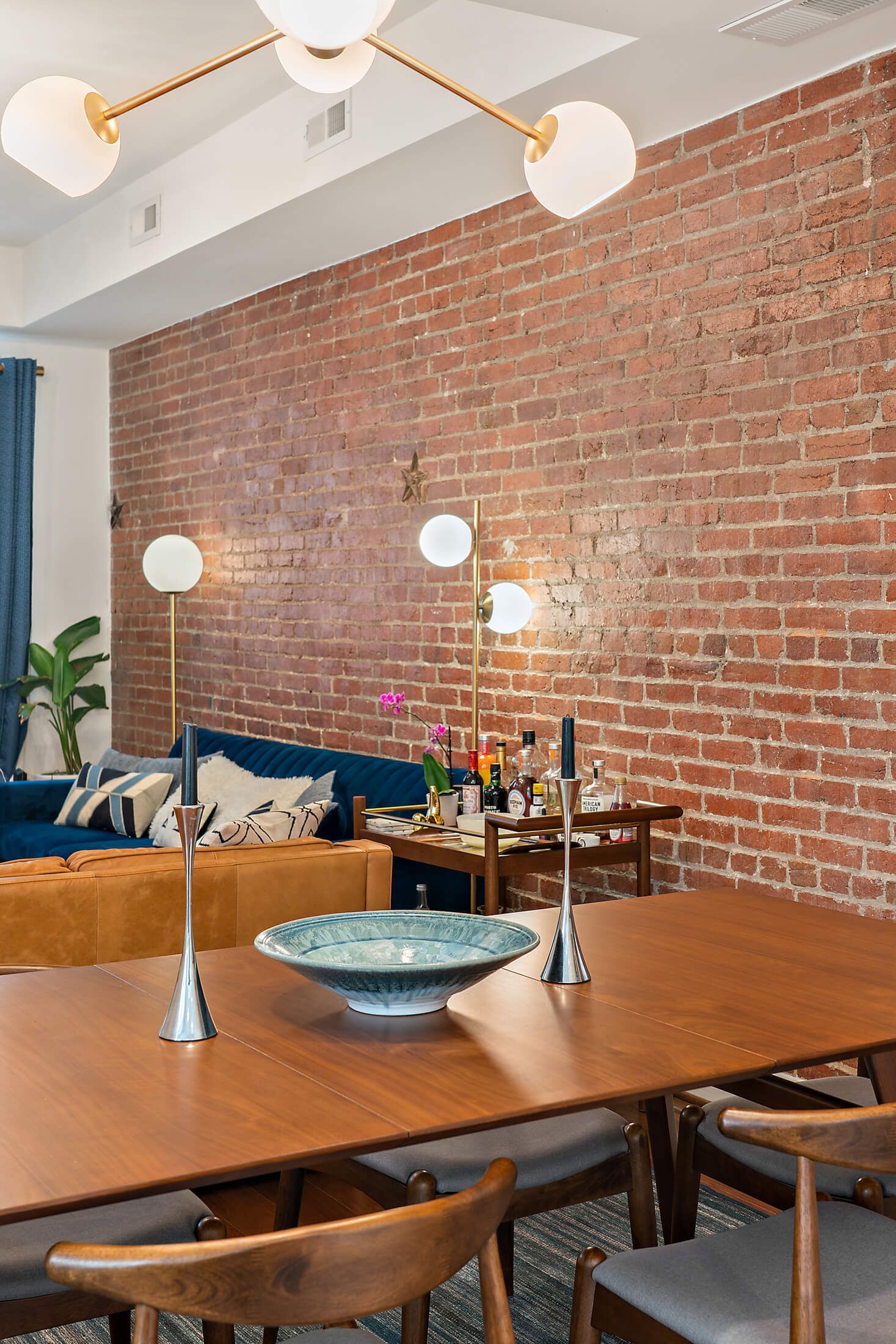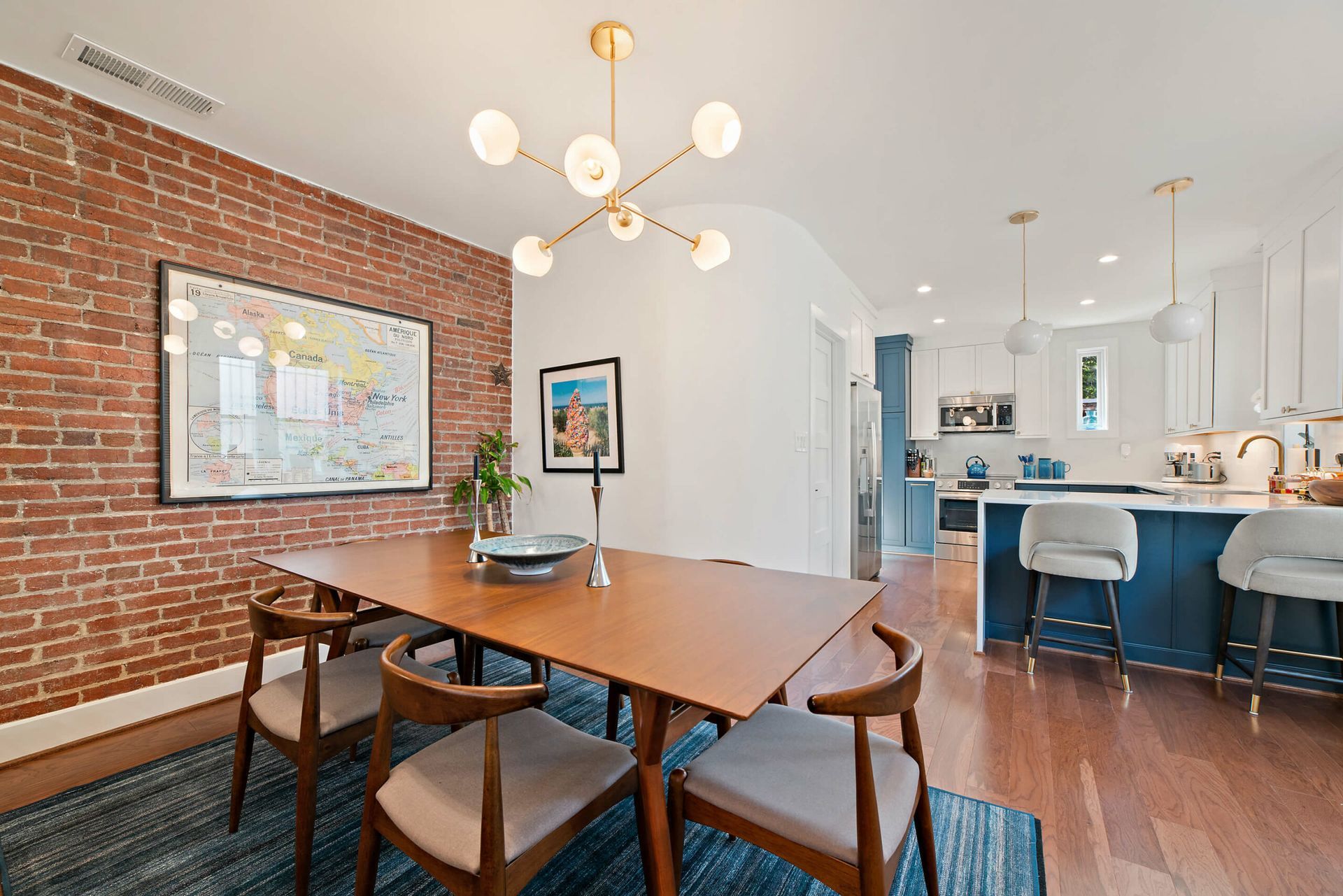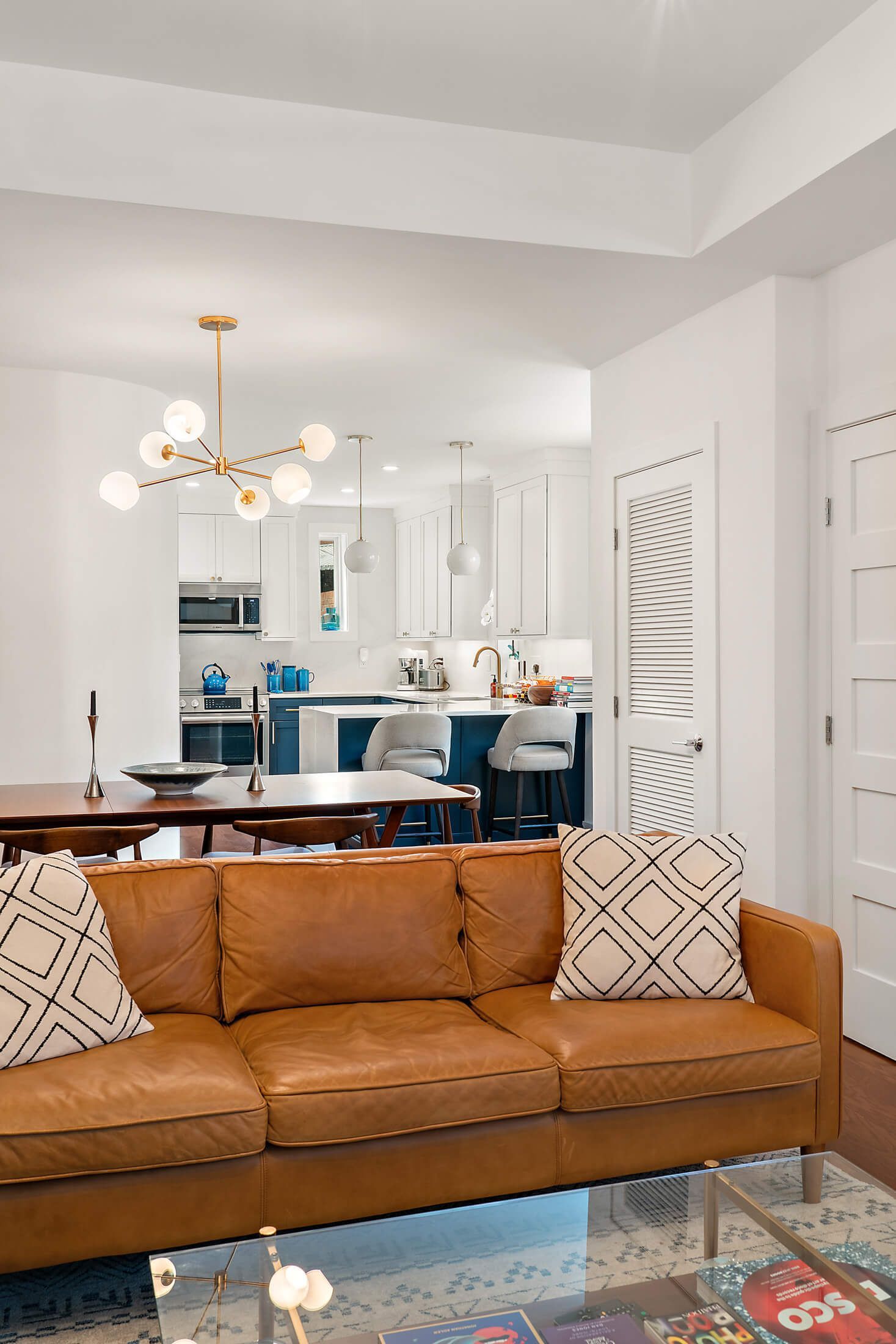 Clean lines meet classic charm in this historic DC kitchen, with a white quartz waterfall peninsula and brass-accented globe lights.