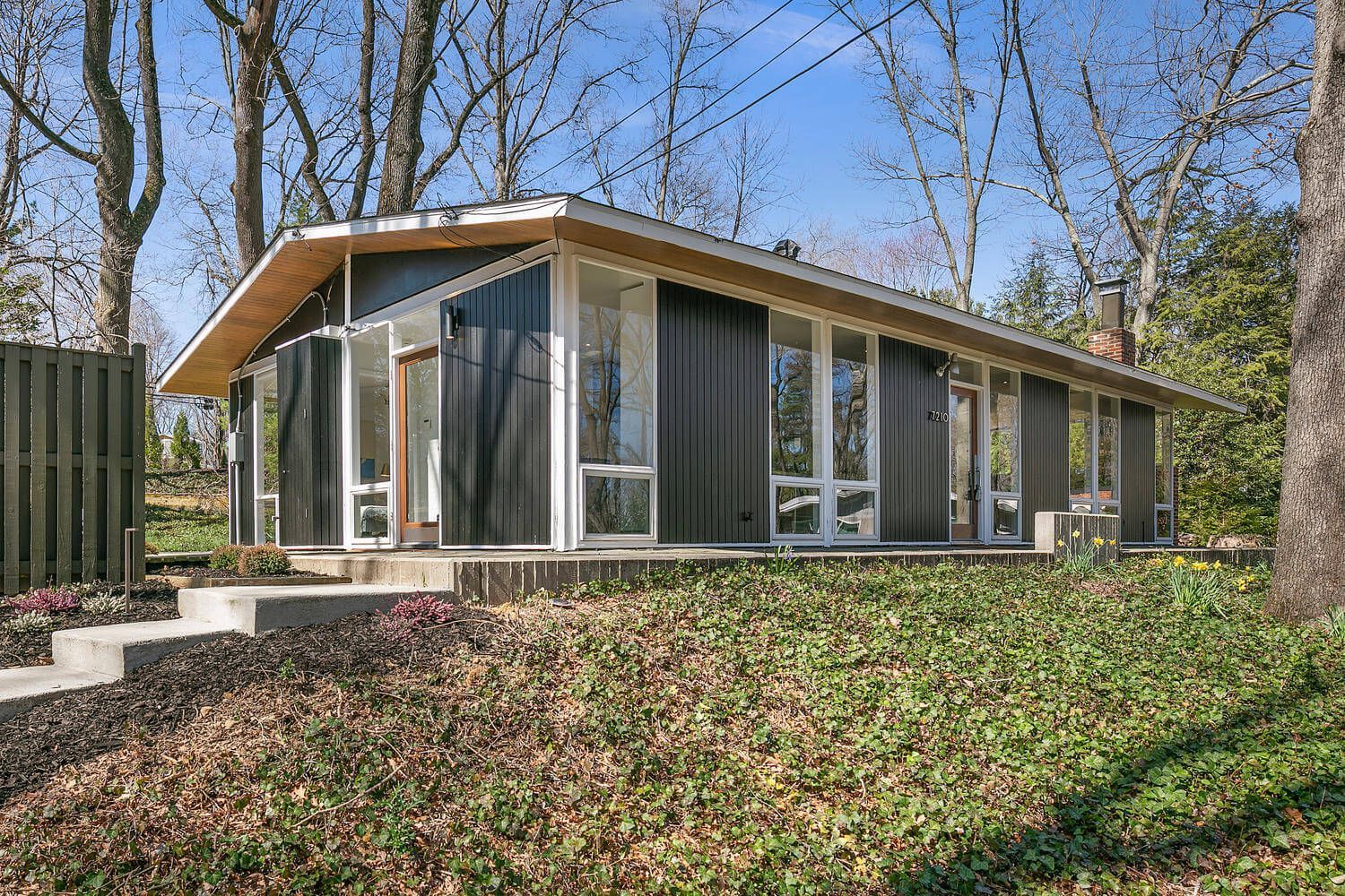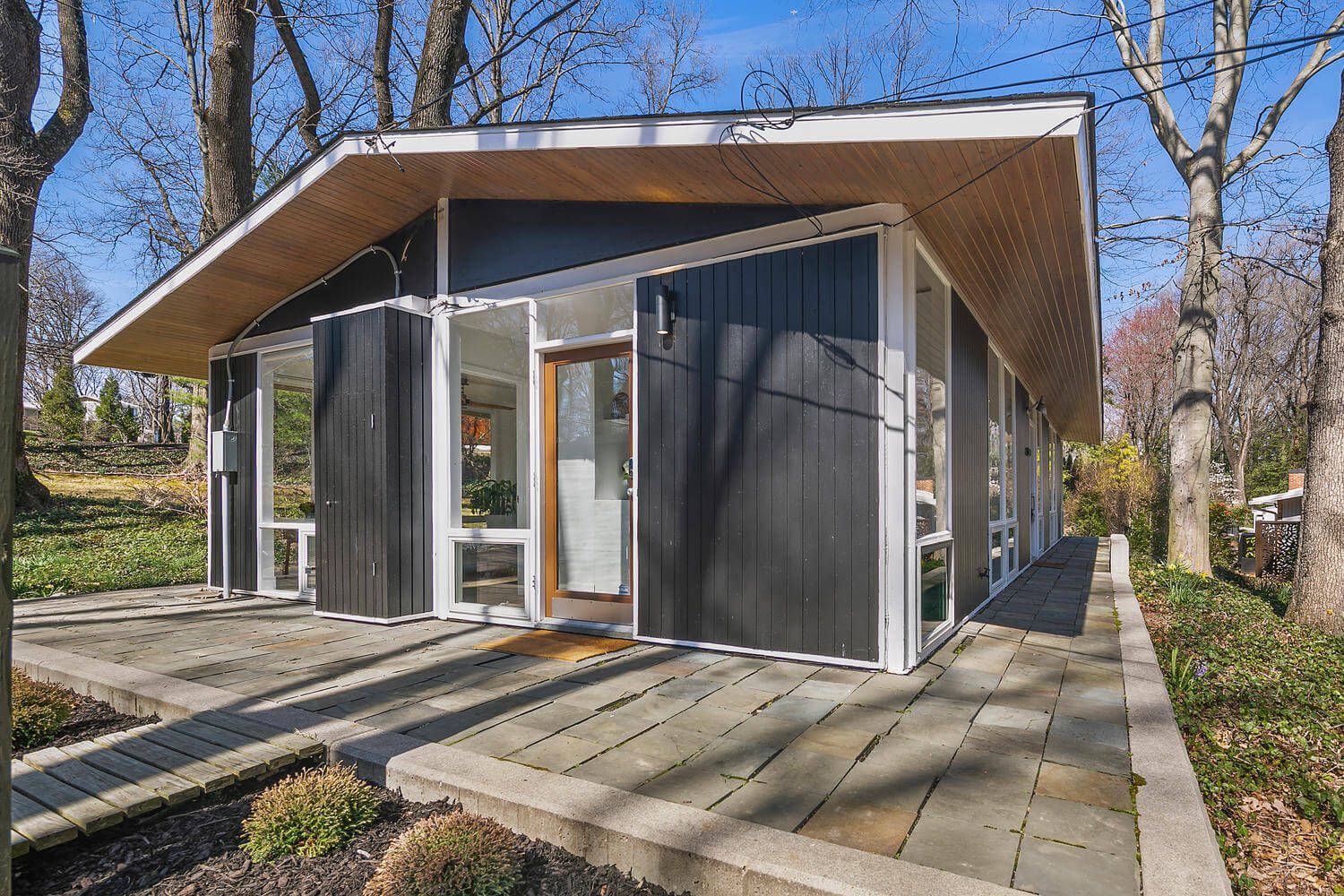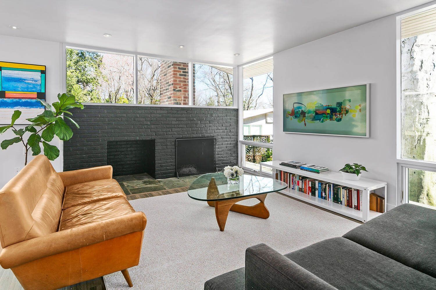 This modern galley kitchen features a striking black accent wall, floor-to-ceiling windows, and clean-lined cabinetry with a chef-worthy range.