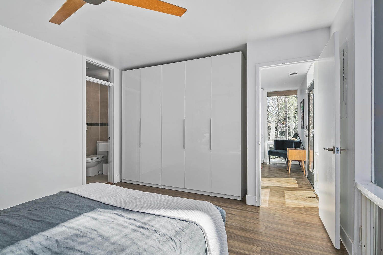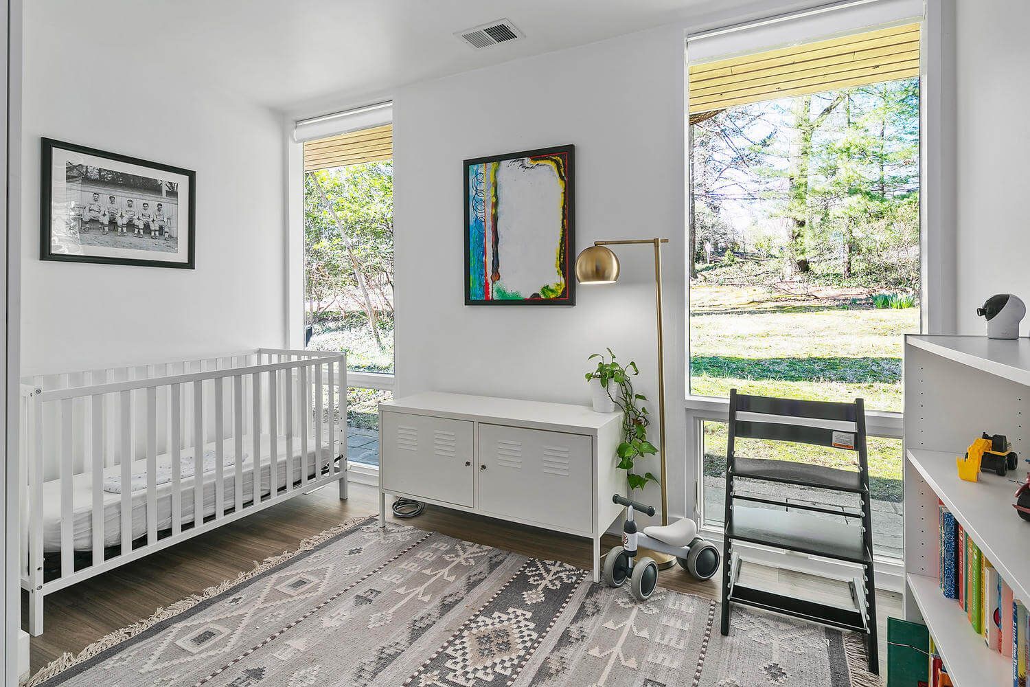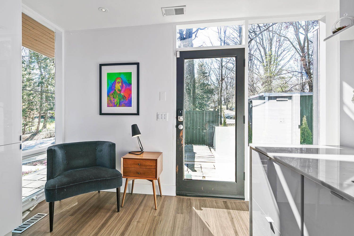 Glossy white cabinetry, natural light, and bold accents give this compact kitchen a fresh, modern feel with room to relax.